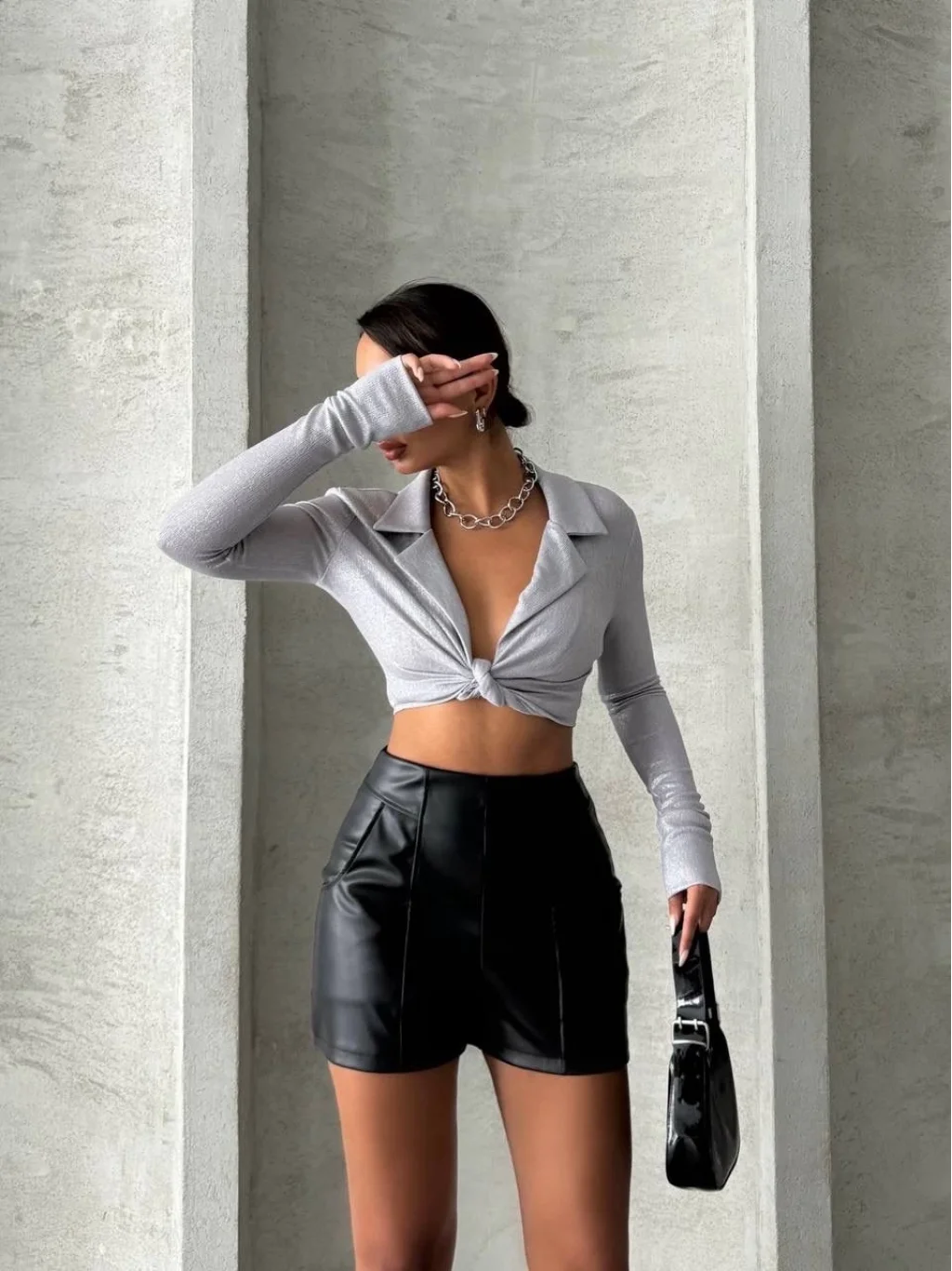 Bu şık ve şıklık arayan kadınlar için ideal olan siyah deri şort, gardırobunuzun vazgeçilmezi olmaya aday. Parçalı cepli tasarımı ile hem şık hem de kullanışlı bir görünüm sunar.