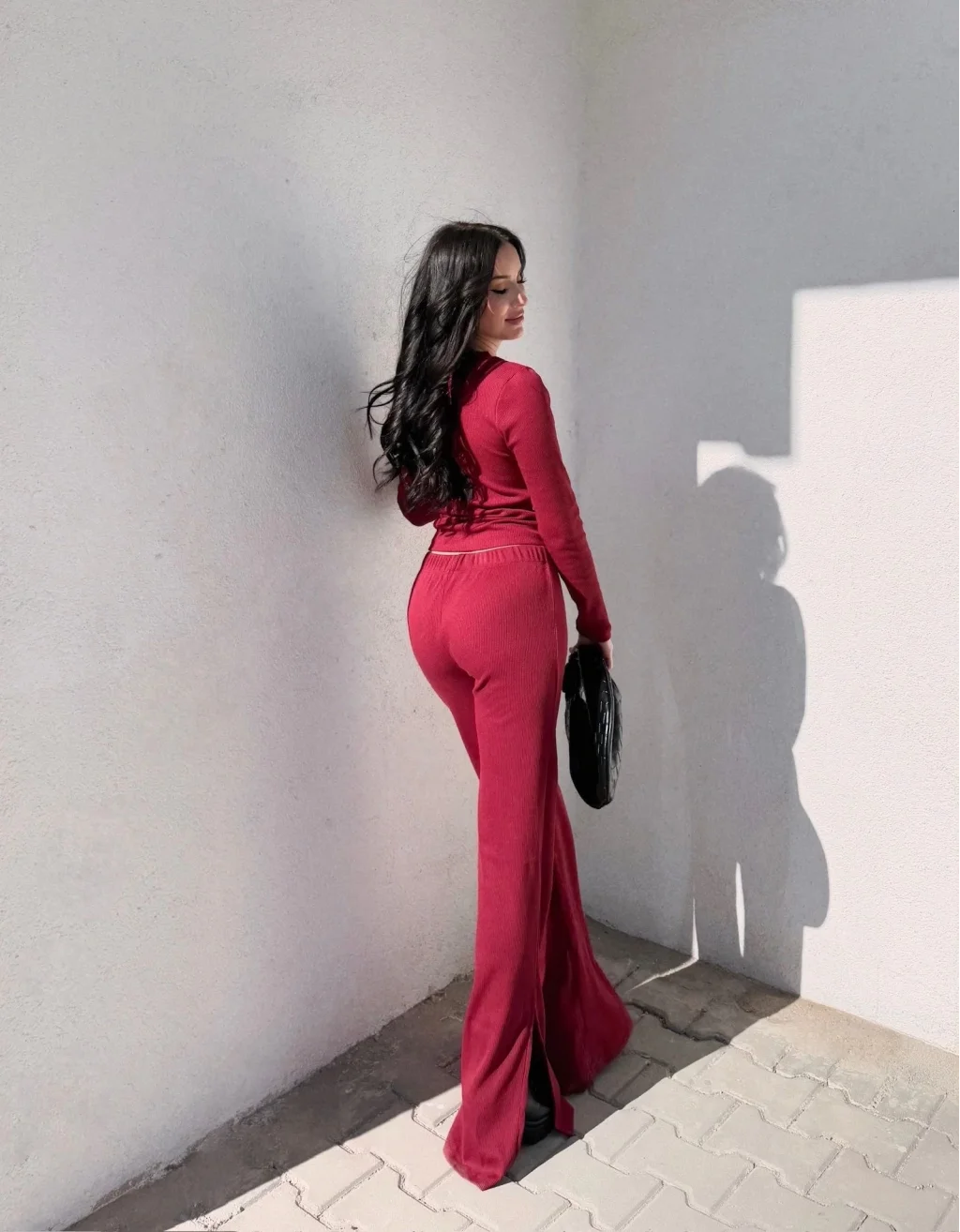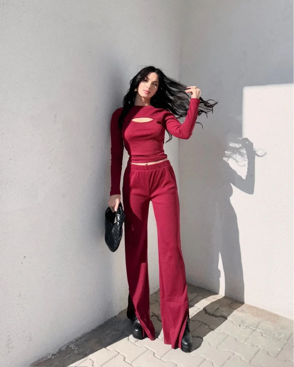 Bordo rengin şıklığına hayran kalacağınız pencereli detaylı alt üst takım, gardırobunuzun vazgeçilmezi olmaya aday!
