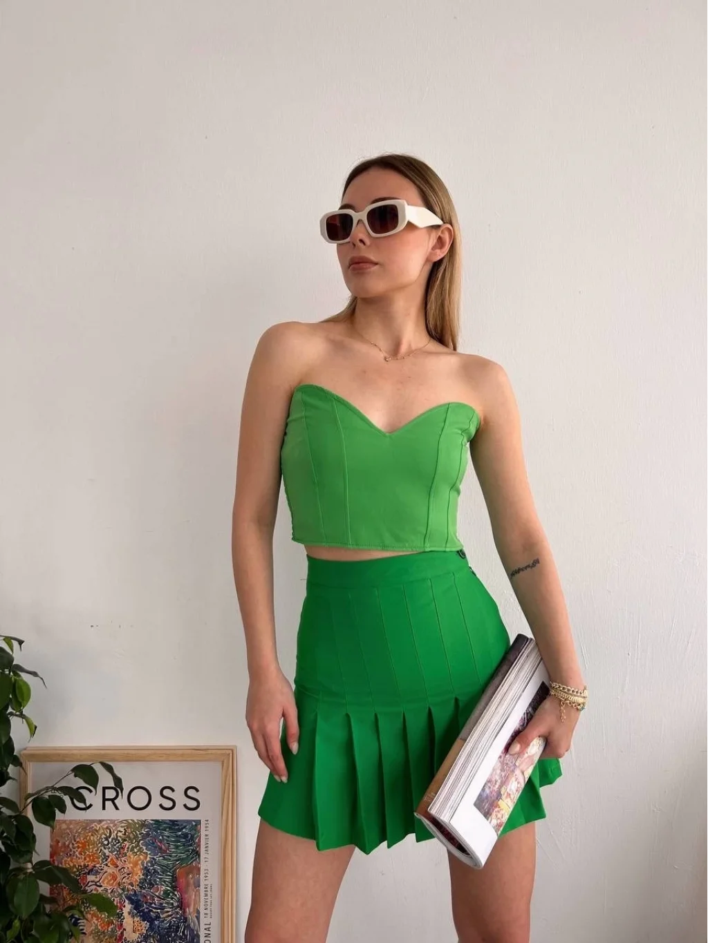 Açık yeşil rengi ile doğanın tazeliğini yansıtan bu etek, her mevsim kolaylıkla kombinlenebilir özelliğiyle dikkat çekiyor.