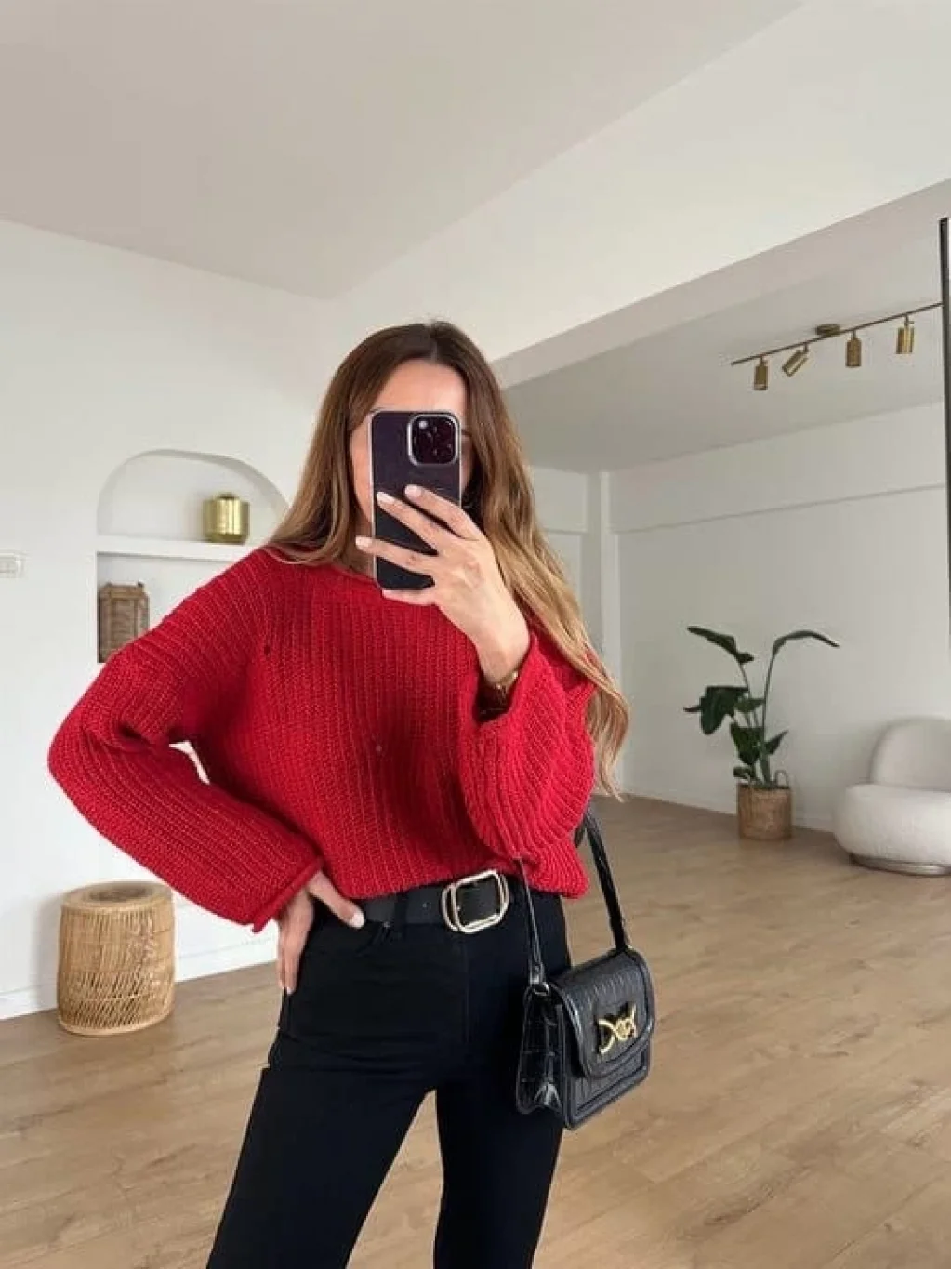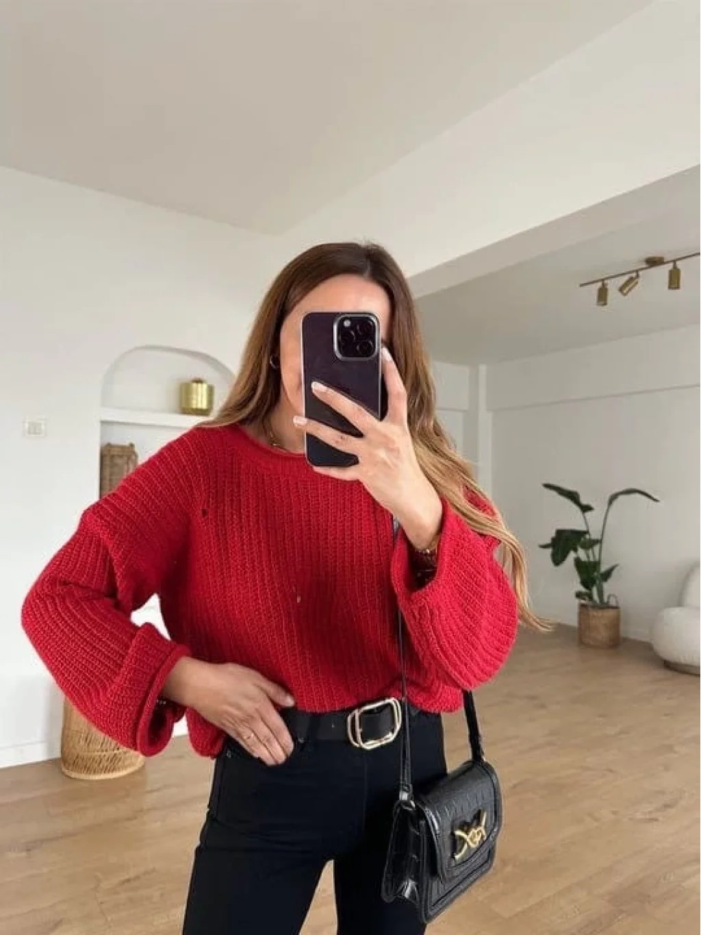 Şıklığı rahatlıkla bir araya getiren Salaş Delik Detaylı Kazak Kırmızı, gardırobunuzun vazgeçilmezi olmaya aday.