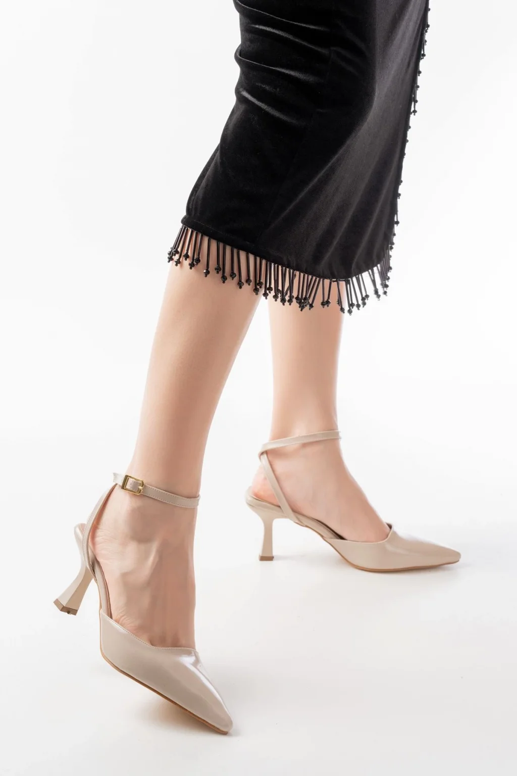 Toran Beyaz Rugan Siyah Süet Detaylı Topuklu Ayakkabı