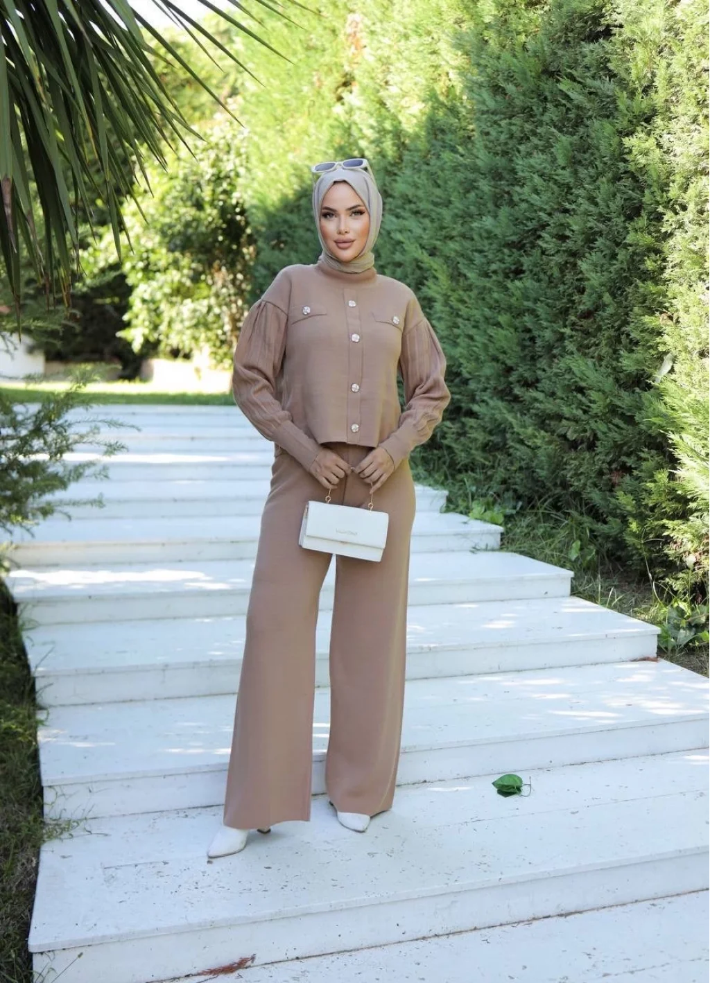 Modern ve şık bir görünüm elde etmek isteyen kadınların tercihi Taş Düğmeli İkili Triko Takım Vizon'u hemen keşfedin!