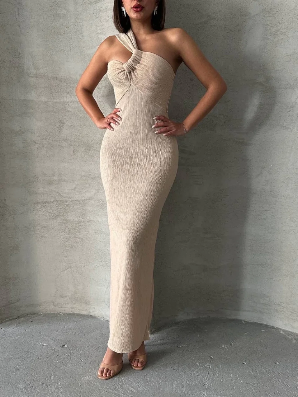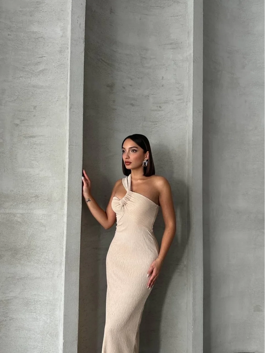 KAZAX marka tek omuz pliseli elbise, şıklık ve zarafeti bir araya getiriyor. Bu tasarım, özel davetlerde ve özel günlerde kendinizi prenses gibi hissetmenizi sağlar.