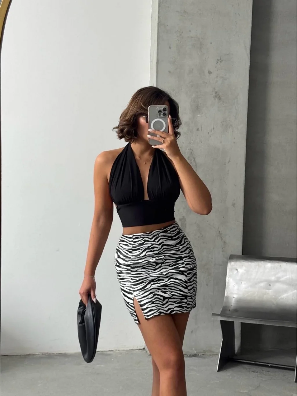 Beyaz deri etek, şıklığı ve modern tasarımı bir arada sunuyor. Zebra desenli detayları ile trend bir görünüm elde etmenizi sağlar.