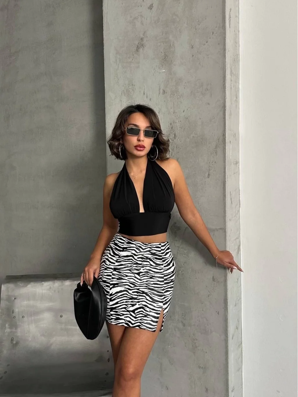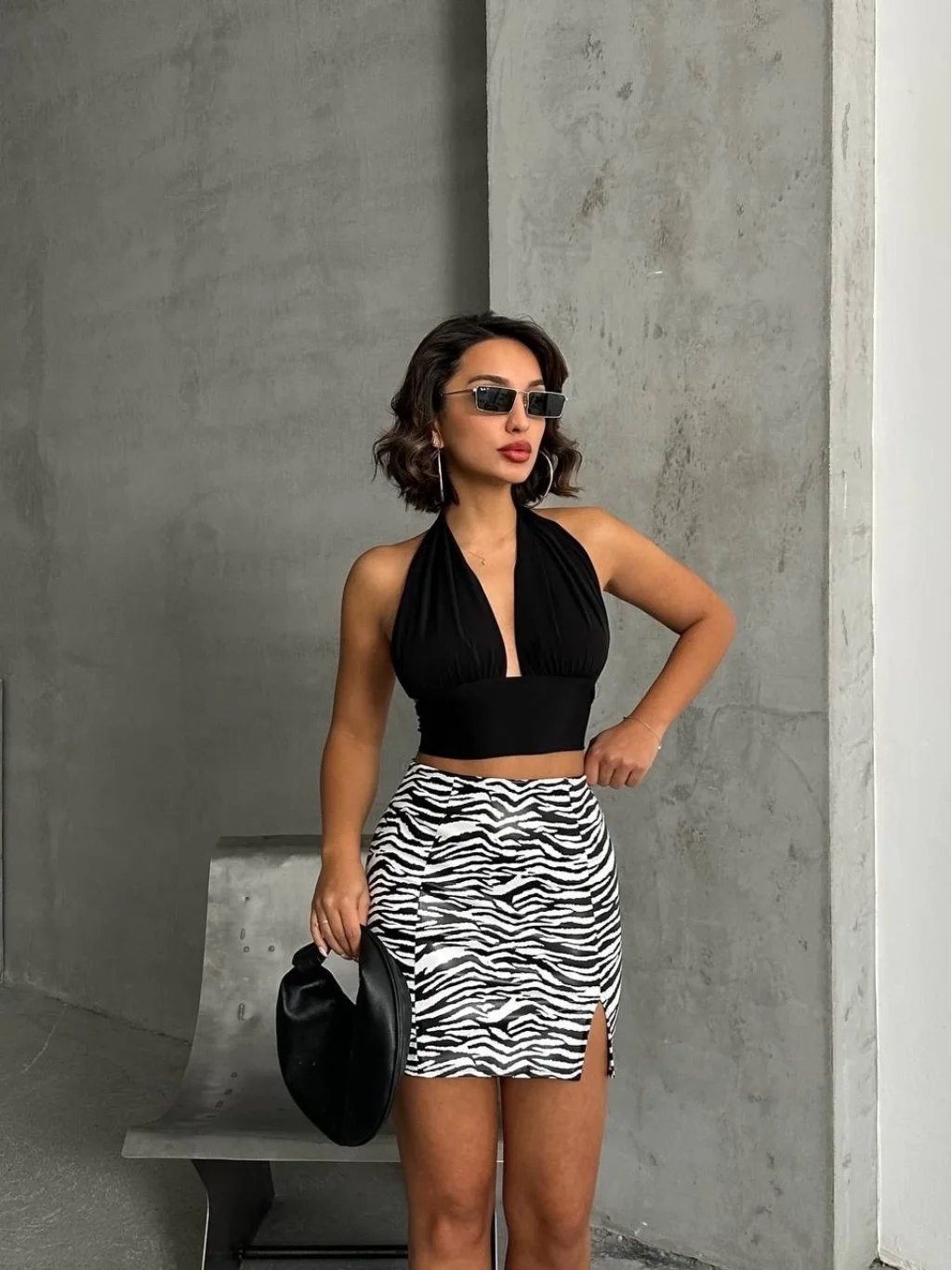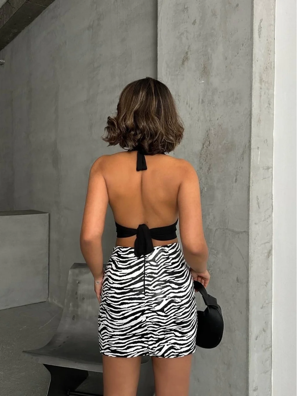 Tek yırtmaçlı zebra desenli deri etek beyazsiyah w24475-S