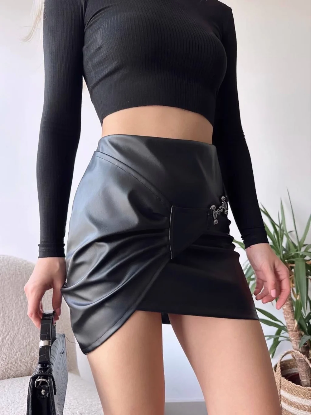 Yeni sezonun trend parçalarından Tokalı Deri Etek Siyah S240097, şık ve zarif görünümüyle öne çıkıyor.