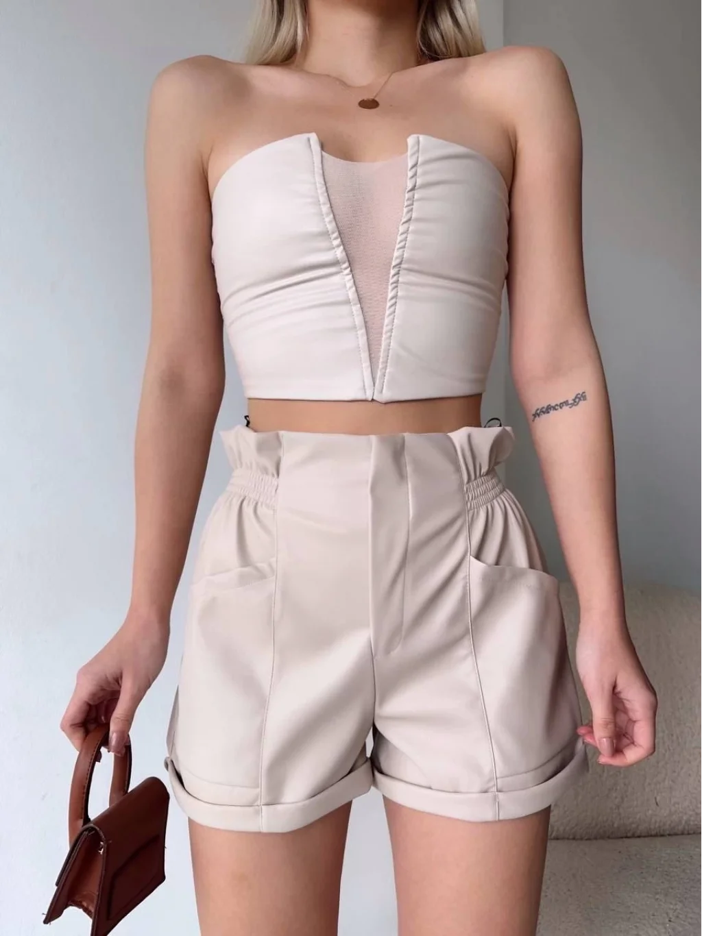 Trendi ve şık tasarımıyla dikkat çeken tüllü deri crop bluz,