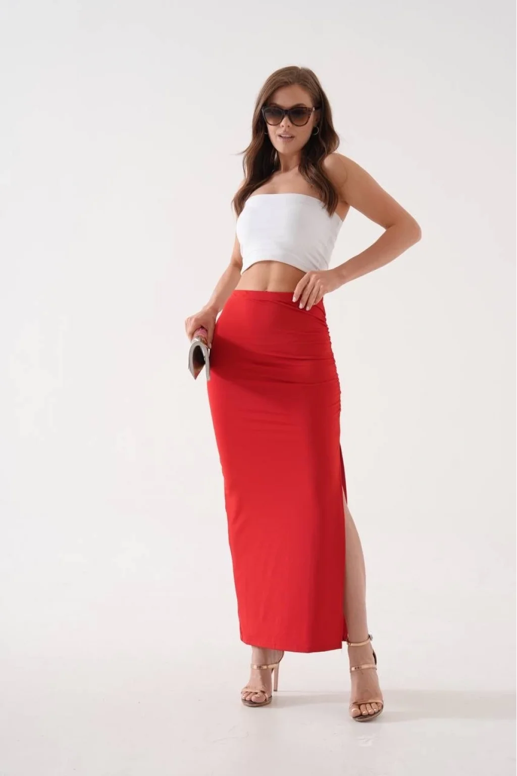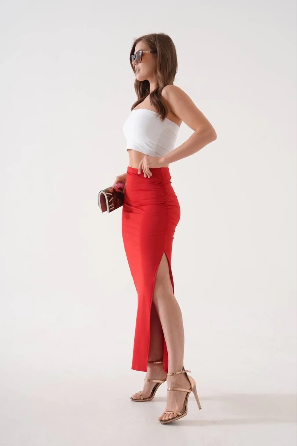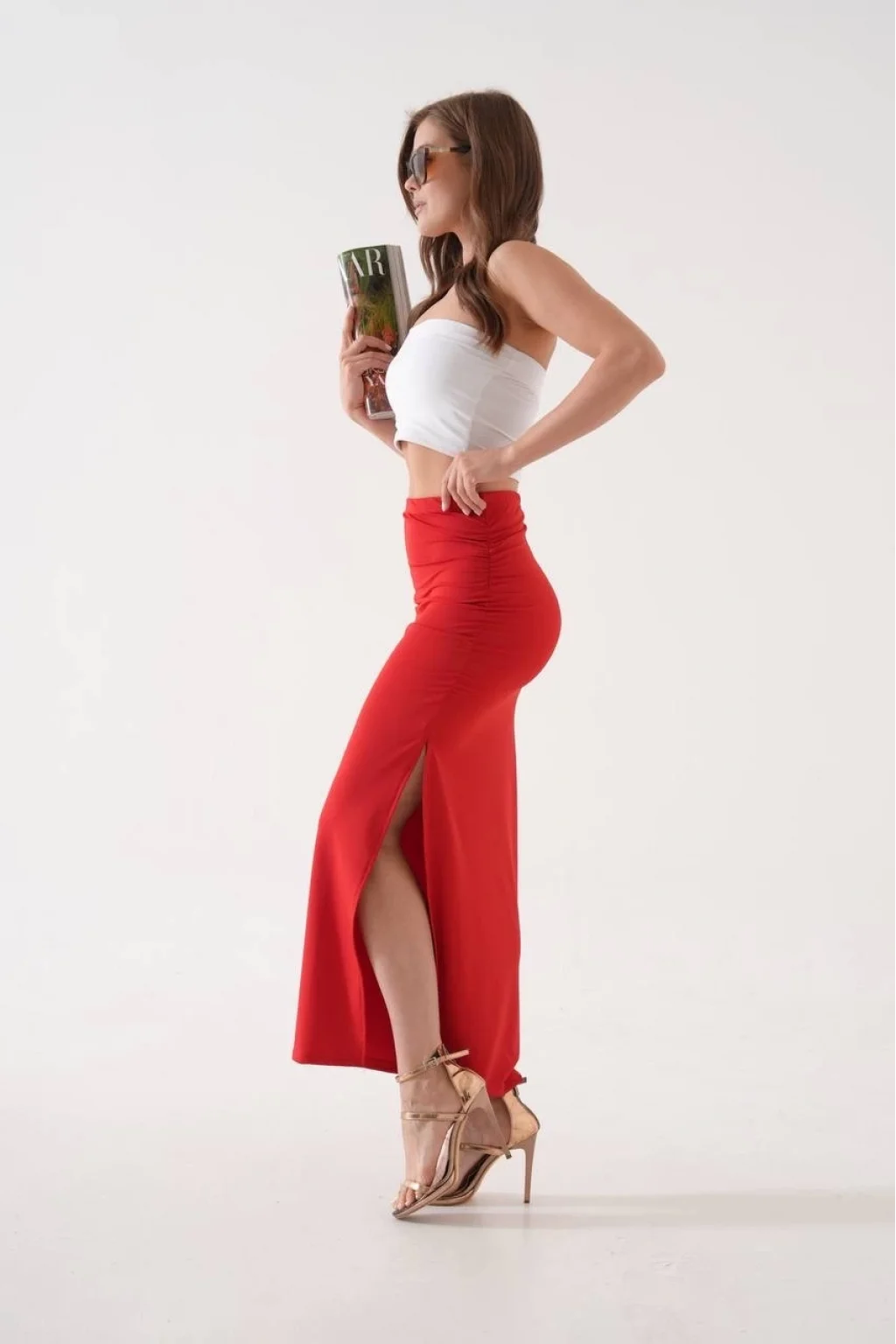 Uzun Yırtmaçlı İnce Kumaş Etek - Kırmızı