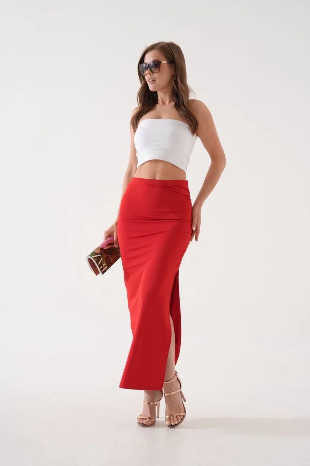 Kırmızı rengi ile dikkat çeken etek, kombinlerinize canlılık katacak.