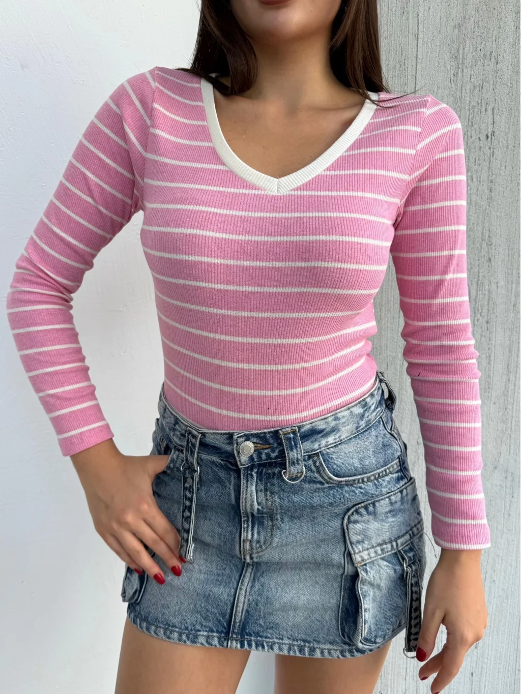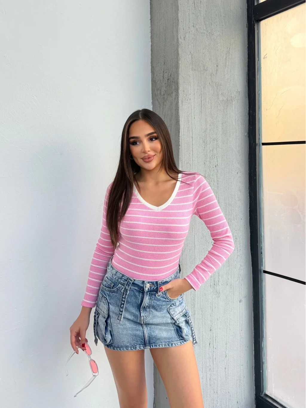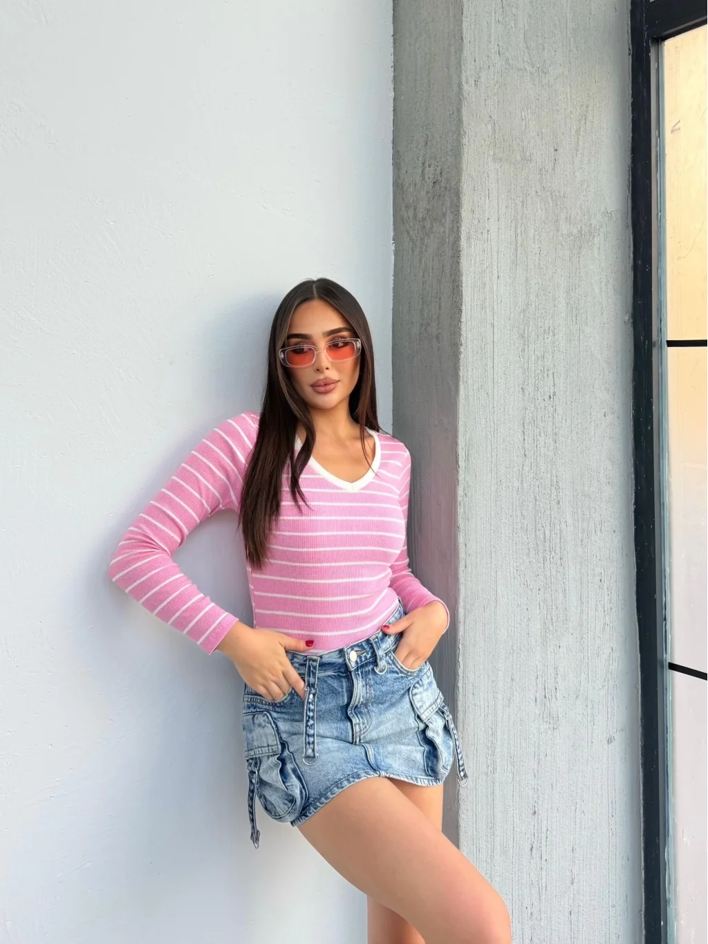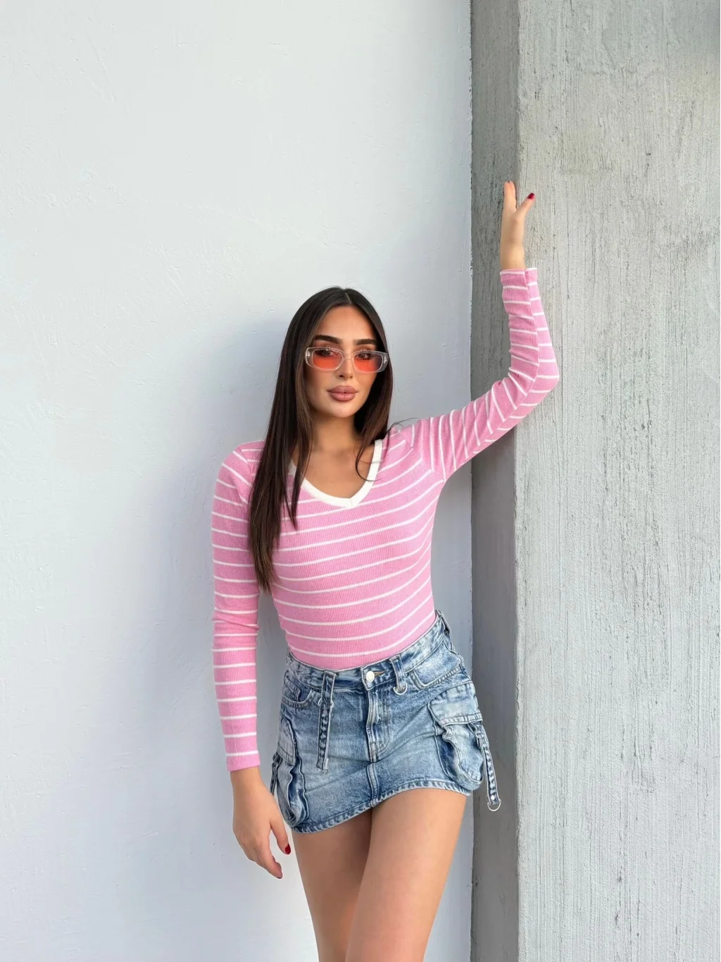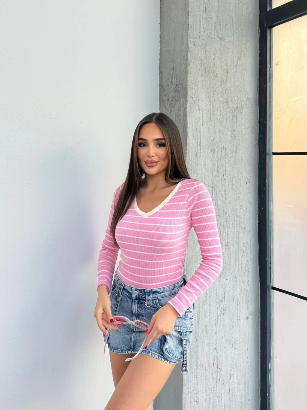 Şık ve feminen tasarımıyla öne çıkan pembe bluz.