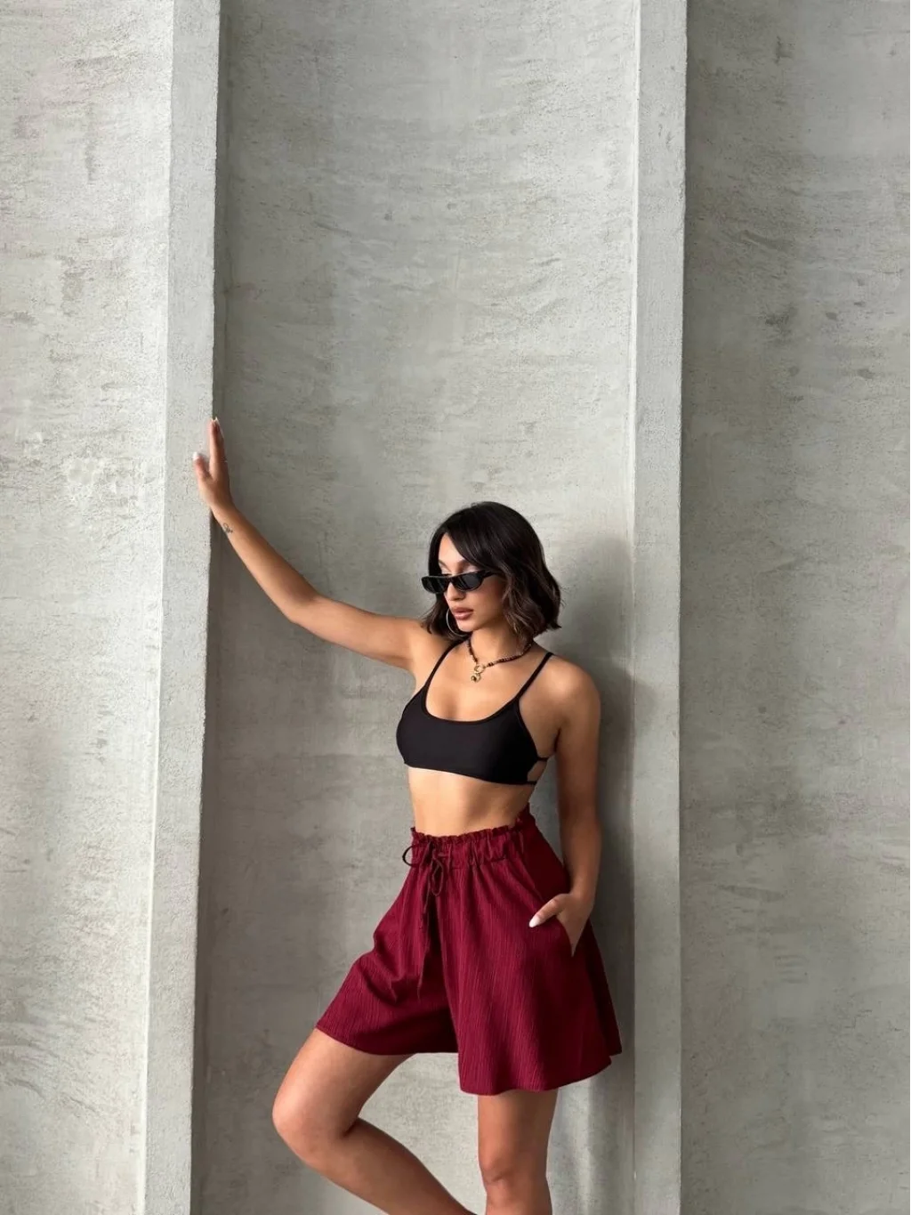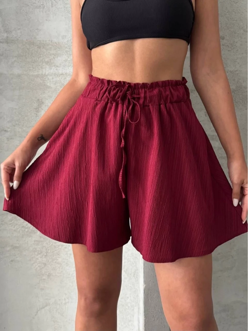 Volanlı keten şort bordo s255058, yaz aylarında şıklığından ödün vermek istemeyen kadınlar için ideal bir seçenektir. İnce ve hafif keten kumaşı sayesinde gün boyu konfor sunar.