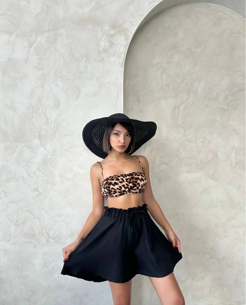 Omuz kısmında yer alan volan detayı ise şortu farklı kılarak tarzını ön plana çıkarır.