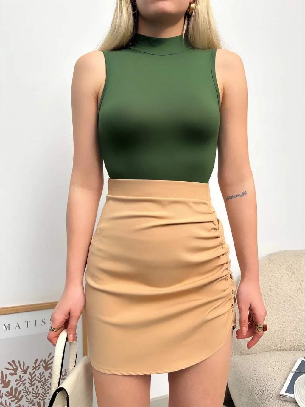 Yanı Büzgülü Etek Camel S24718, şıklığı ve rahatlığı bir arada sunan bir parçadır.
