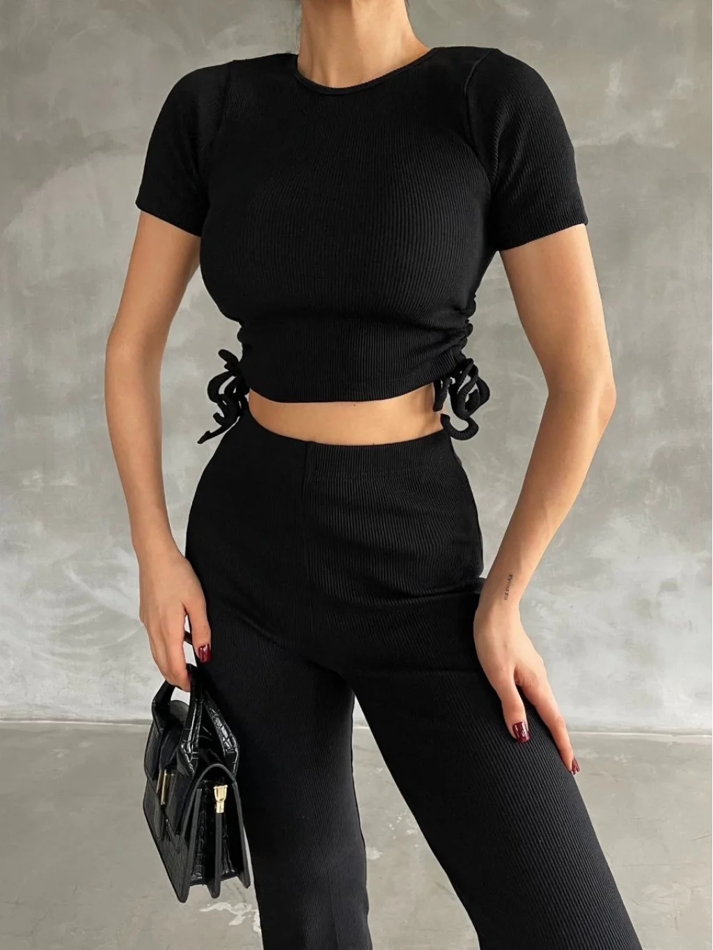 Yanları tünel detaylı pantolonu, uyumlu bluzu ile kombin tamamlar.