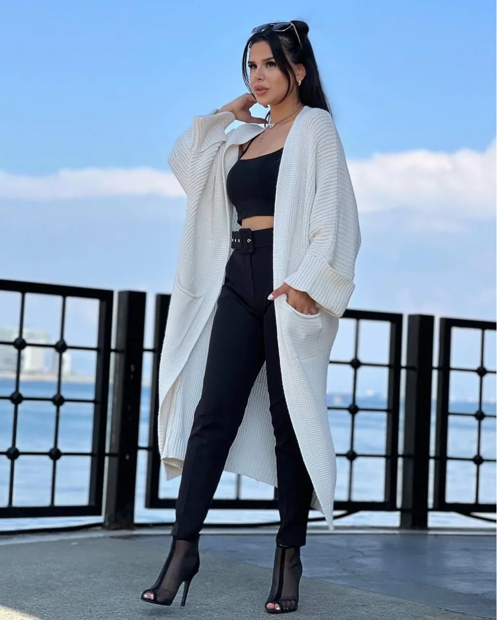 Yarasa kol uzun triko hırka beyaz, hem şıklığı hem de rahatlığı bir arada sunar.
