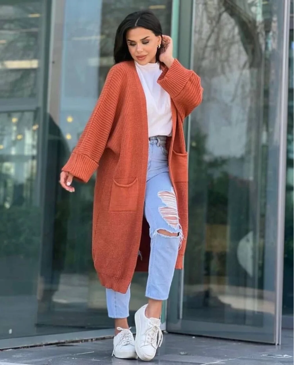 Yarasa kol detayıyla şık bir görünüm sunan Triko Hırka Kremit, hem rahat hem de şıklığı bir arada sunuyor.