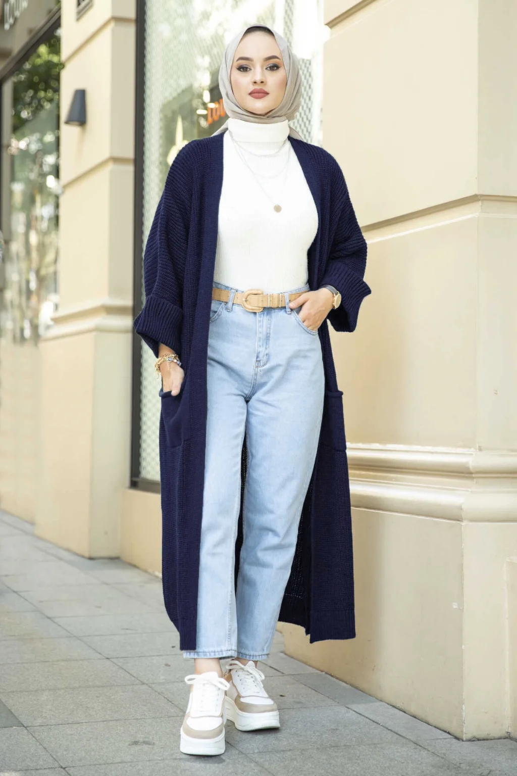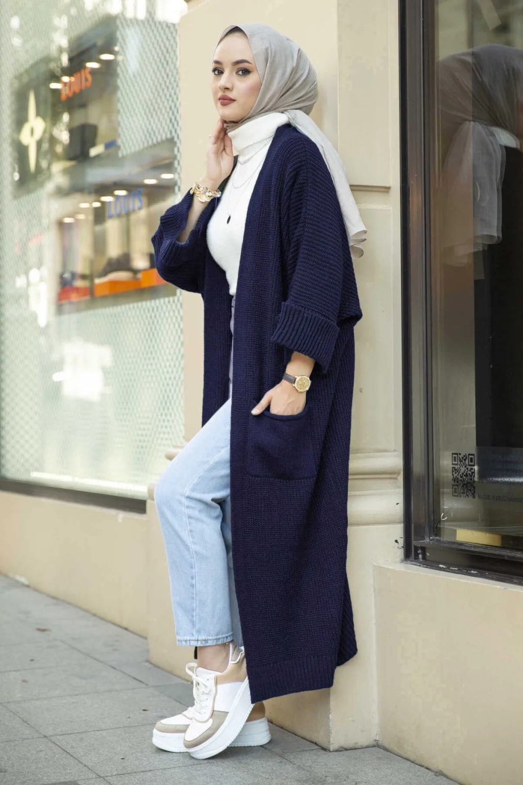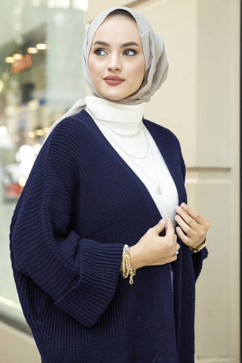 Yarasa kol uzun triko hırka lacivert, hem şık hem de rahat bir seçenektir. İnce triko kumaştan üretilmiştir ve hafif yapısıyla her mevsim rahatlıkla kullanılabilir.