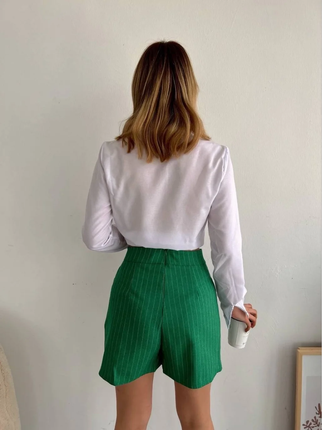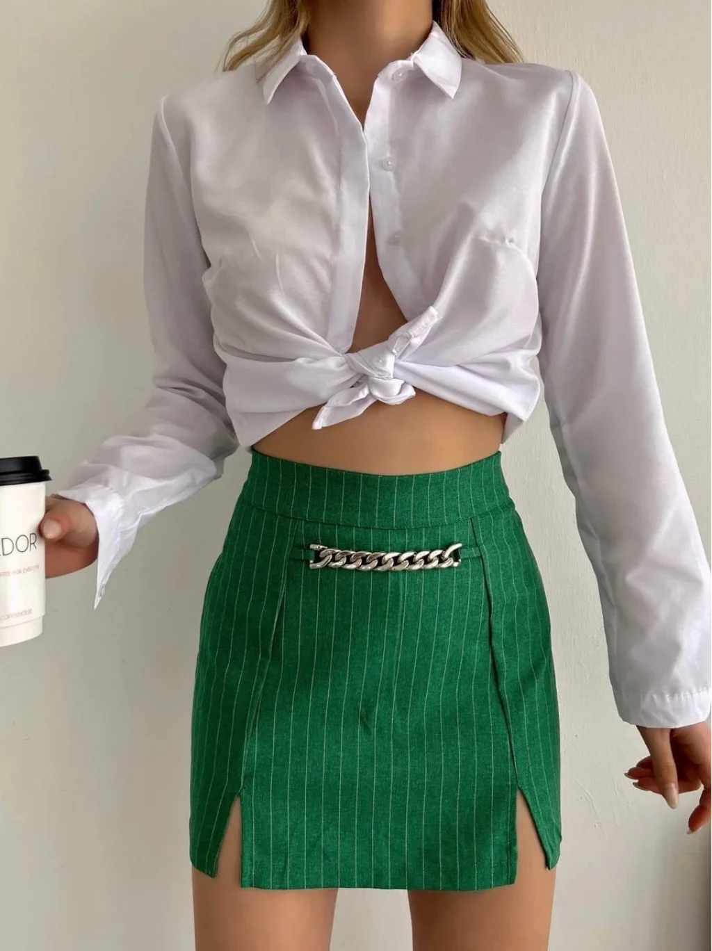KAZAX marka zincir detaylı çizgili şort etek, şıklık ve rahatlık arayan kadınların tercihi.