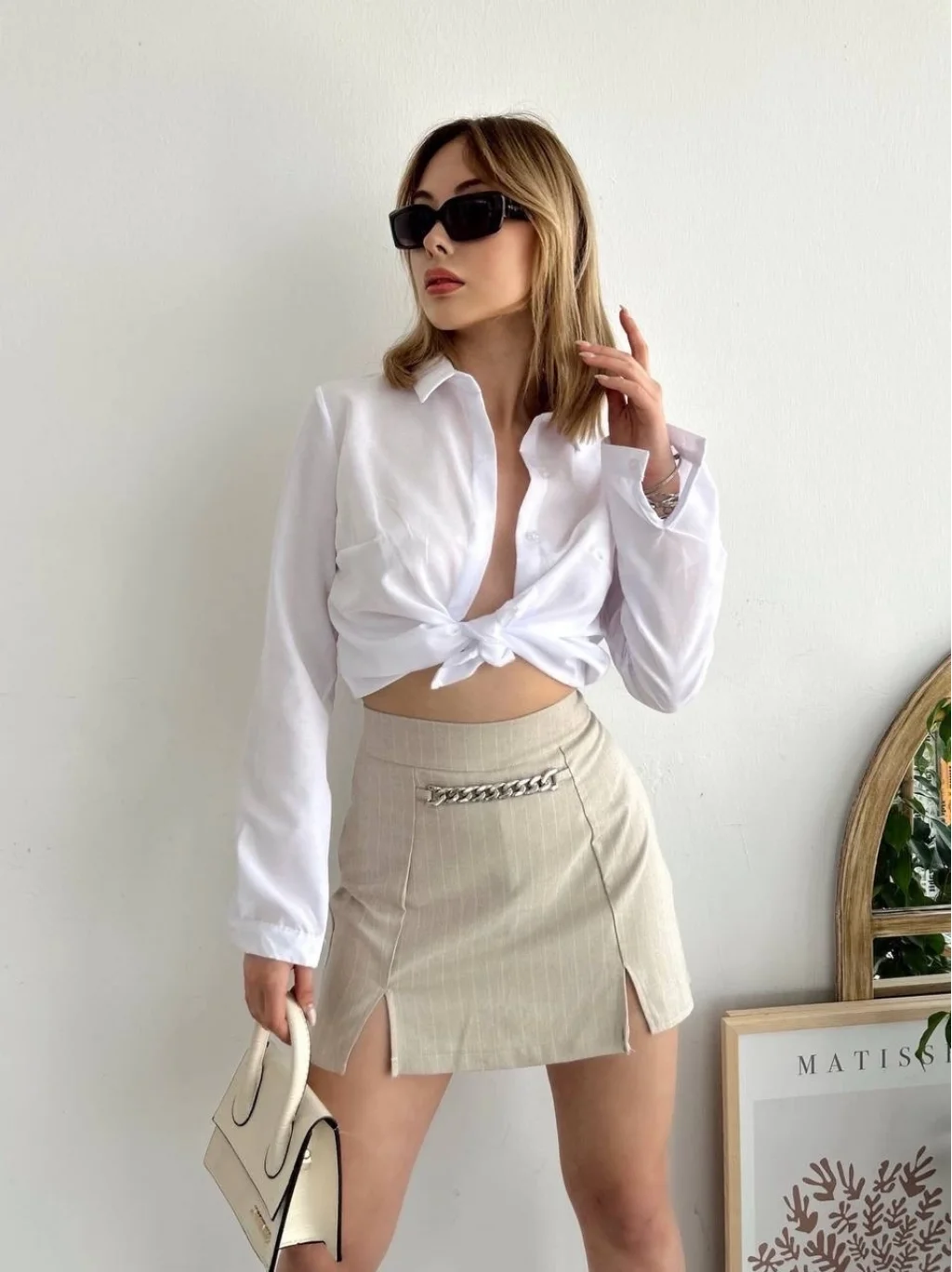 KAZAX marka zincir detaylı çizgili şort etek, şıklık ve rahatlık arayan kadınların tercihi.