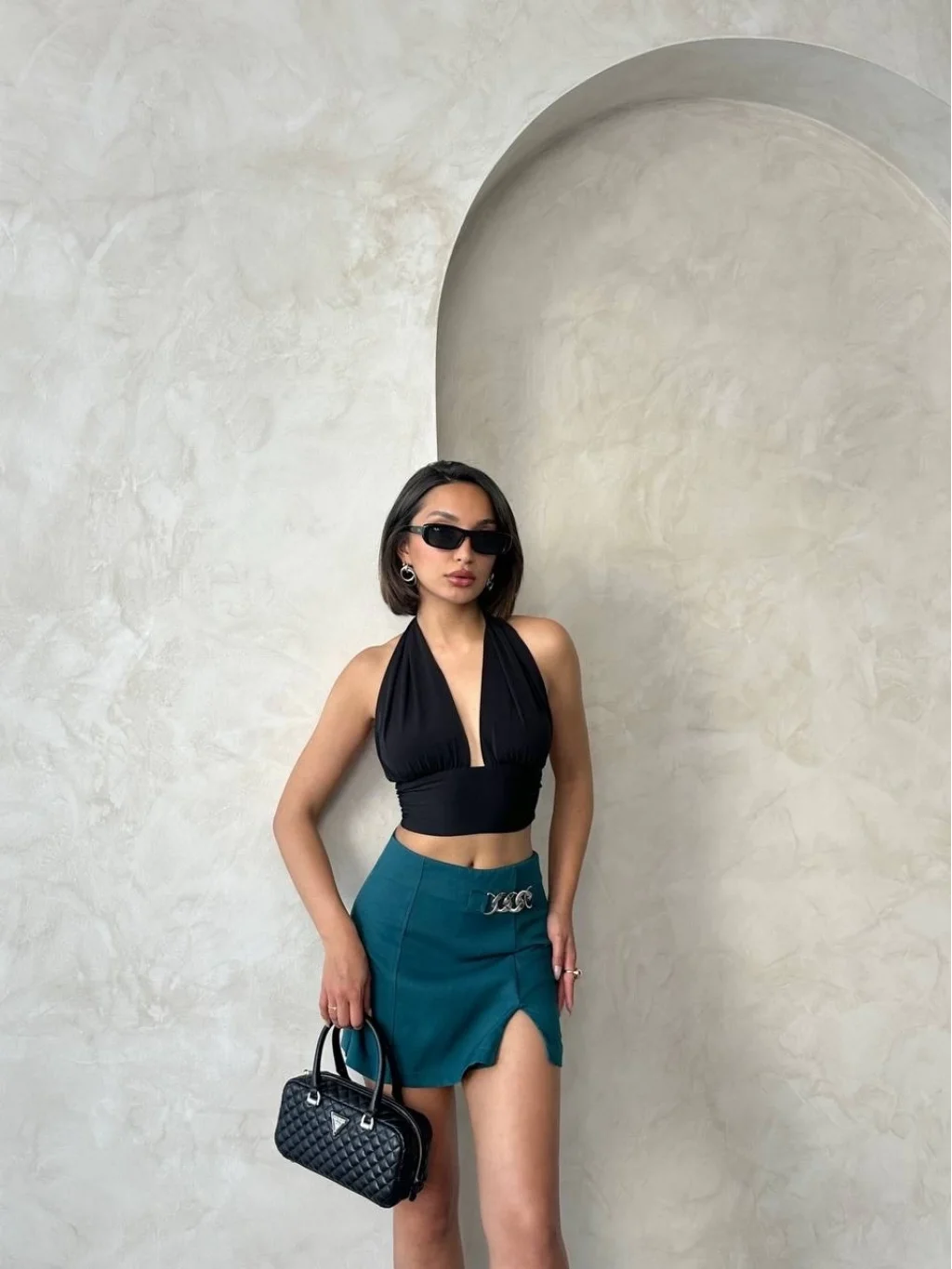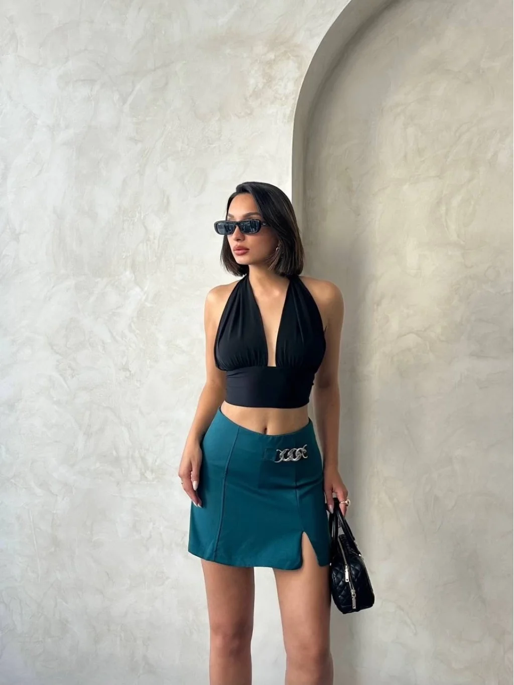 Sezonun trend parçalarından Zincirli Şort Etek S24676, şıklığı ve rahatlığı bir arada sunuyor.